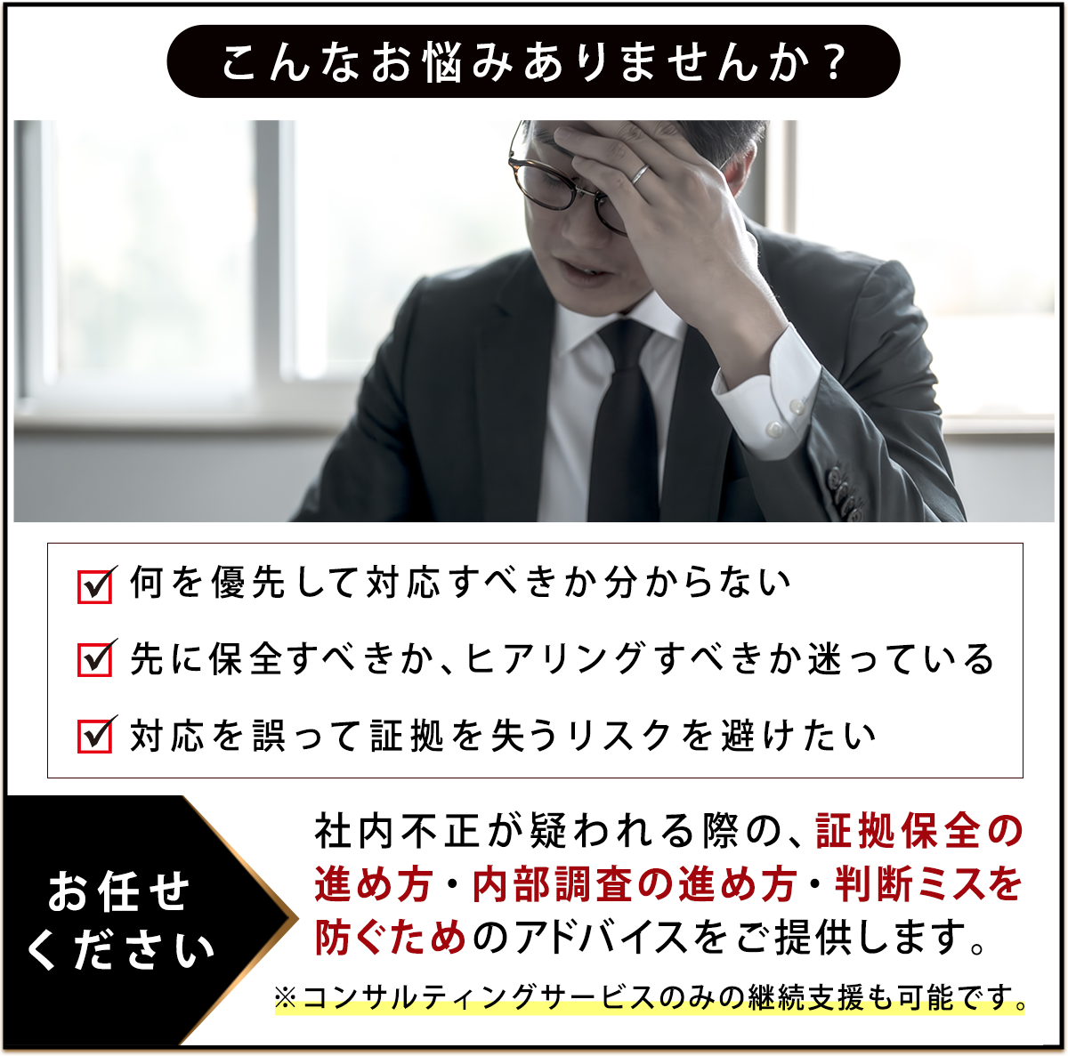 不正が発覚した直後は、組織が混乱しやすく、結果として対象者に証拠隠滅の機会を与えてしまったり、本来確保できたはずの証拠を取り逃したりするケースが少なくありません。初動の判断ひとつで、調査の成否や、その後に取れる選択肢は大きく変わります。